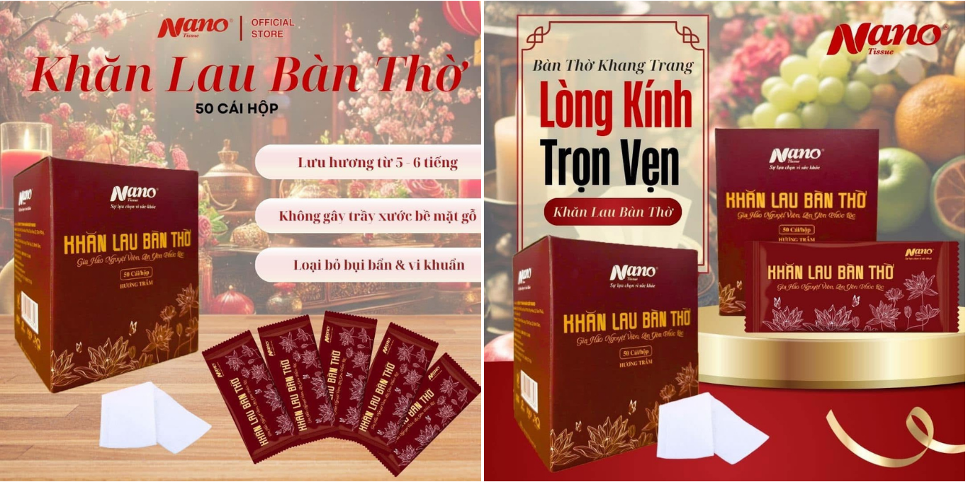 Trong đời sống văn hóa người Việt, bàn thờ là không gian linh thiêng, thể hiện đạo lý “uống nước nhớ nguồn”. Vì vậy, việc lau dọn bàn thờ, nhất là dịp Tết, luôn được thực hiện cẩn trọng và thành kính. Khăn lau bàn thờ Nano Tissue – Hương trầm ra đời như giải pháp tinh tế, giúp vệ sinh sạch sẽ, nhẹ nhàng mà vẫn giữ trọn sự trang nghiêm.