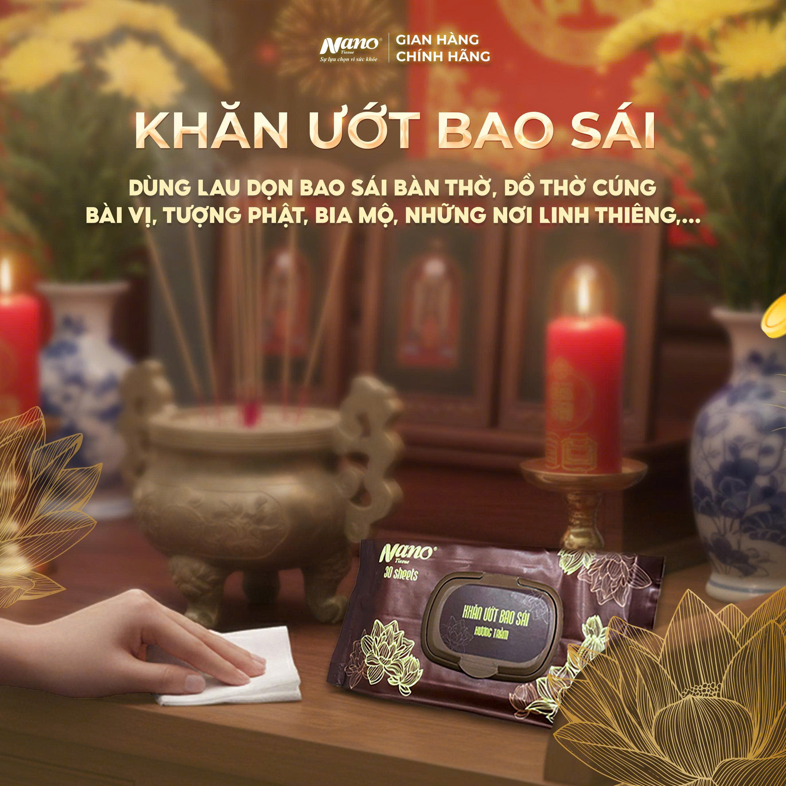 Không gian thờ cúng là nơi linh thiêng, thể hiện lòng thành kính của mỗi gia đình Việt. Vì vậy, việc lau dọn, bao sái bàn thờ không chỉ cần sạch sẽ mà còn phải đúng cách, an toàn và giữ được sự thanh tịnh. Thấu hiểu điều đó, Nano Tissue cho ra mắt khăn ướt bao sái lau bàn thờ Nano Tissue – Hương trầm, giải pháp tiện lợi giúp việc lau bàn thờ trở nên nhẹ nhàng, trang nghiêm và trọn vẹn hơn.