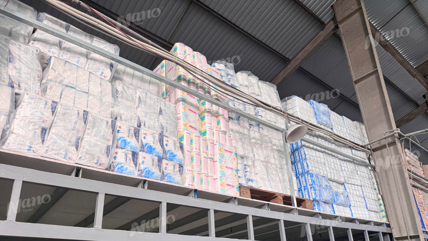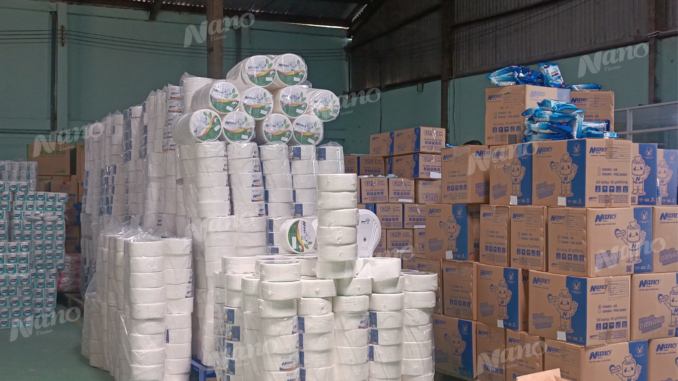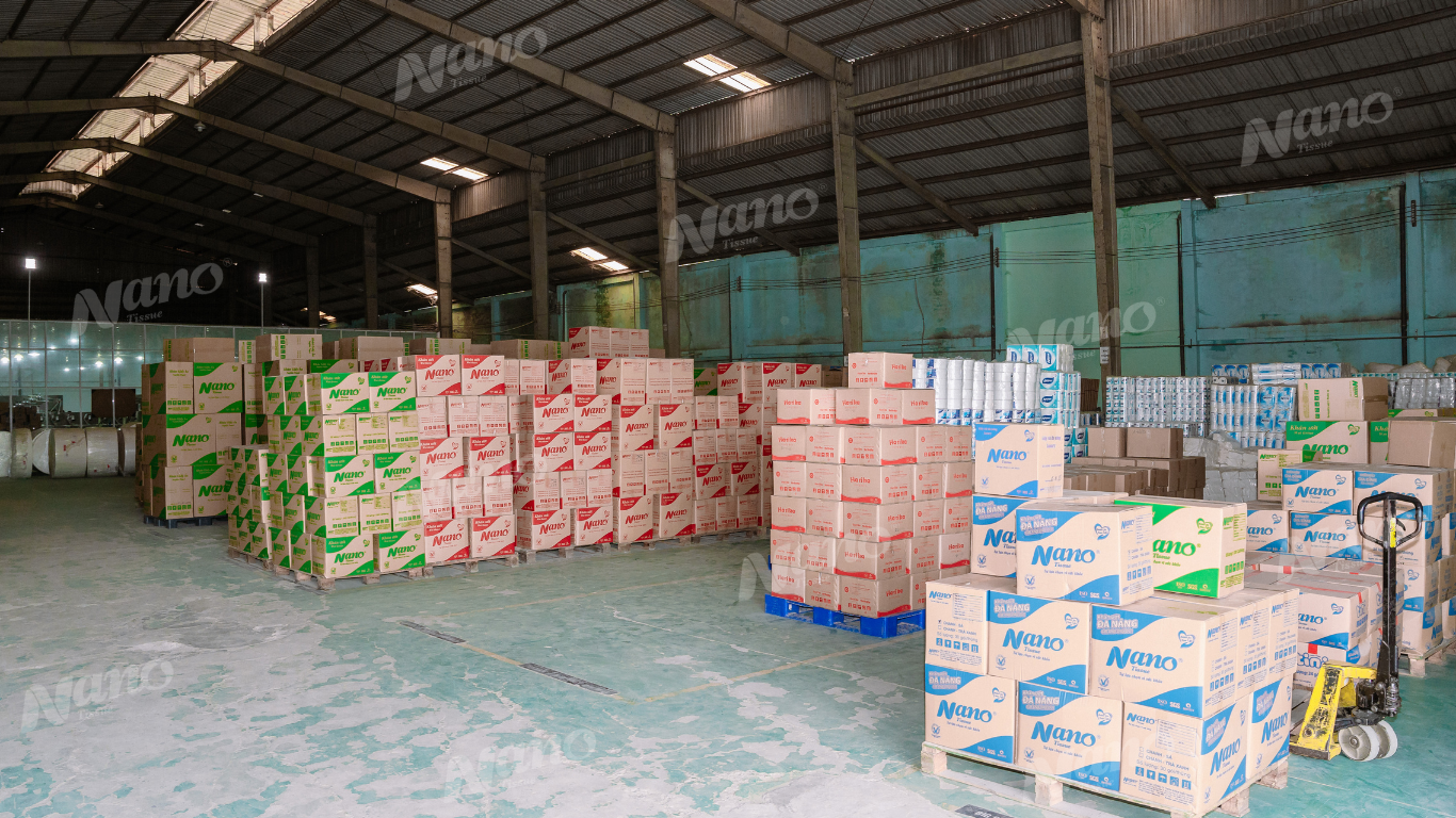 Tổng kho sỉ giấy ăn tại Nano Tissue không chỉ là nơi lưu trữ mà còn là cơ sở sản xuất và gia công khăn giấy, khăn ướt hiện đại với diện tích hơn 2.500m².