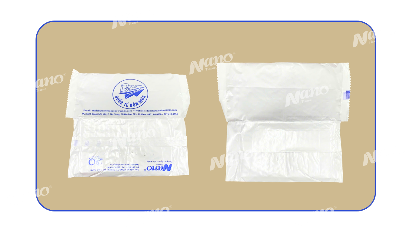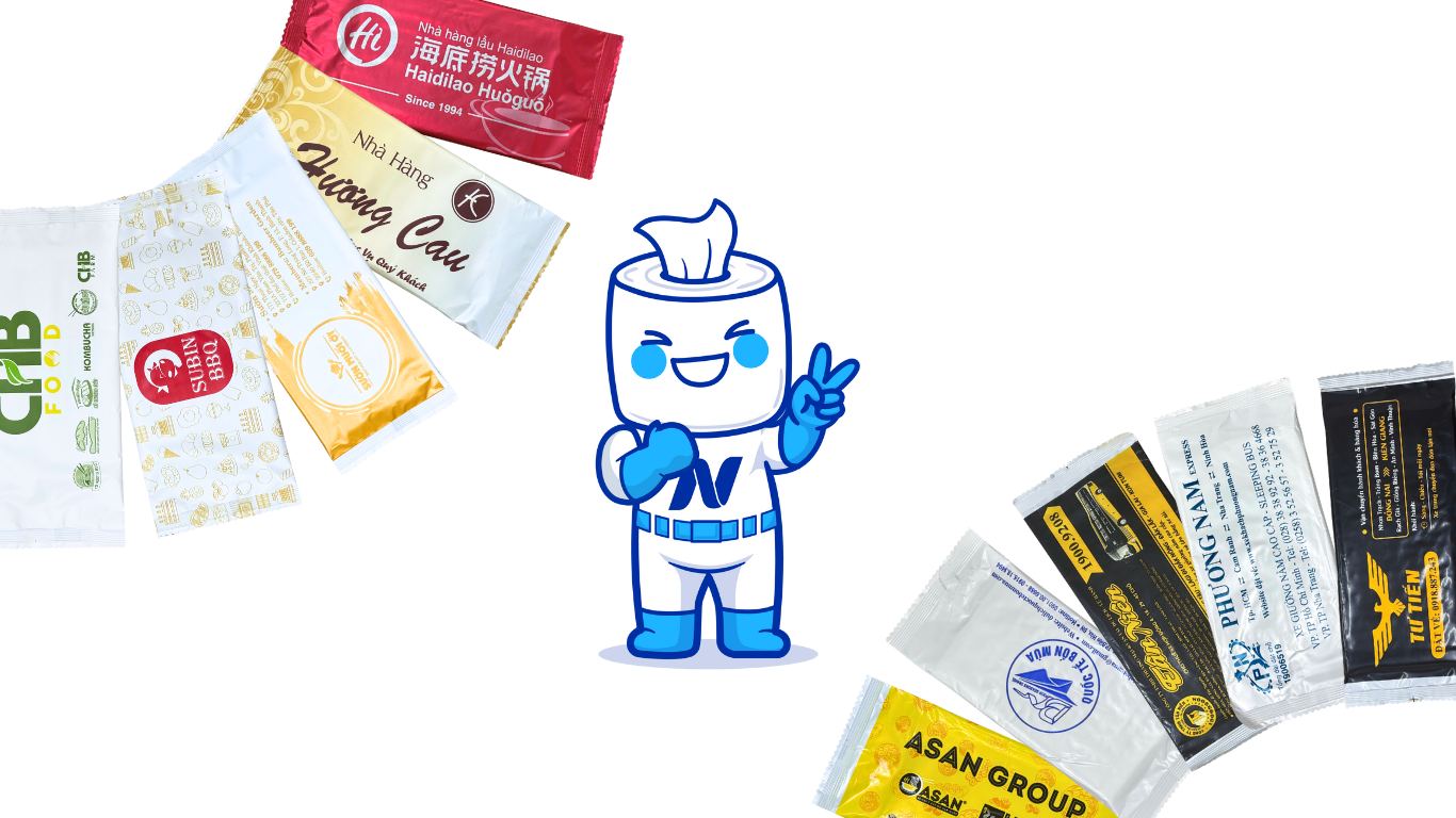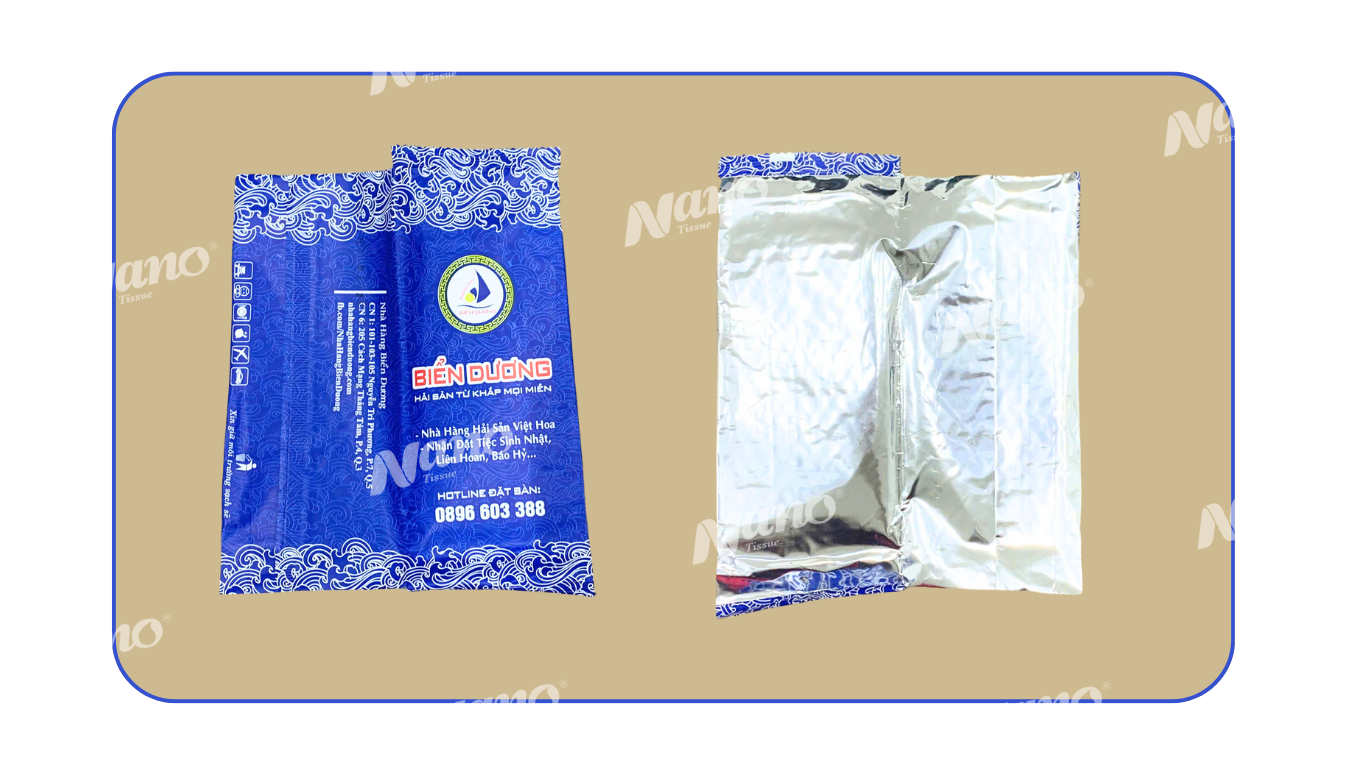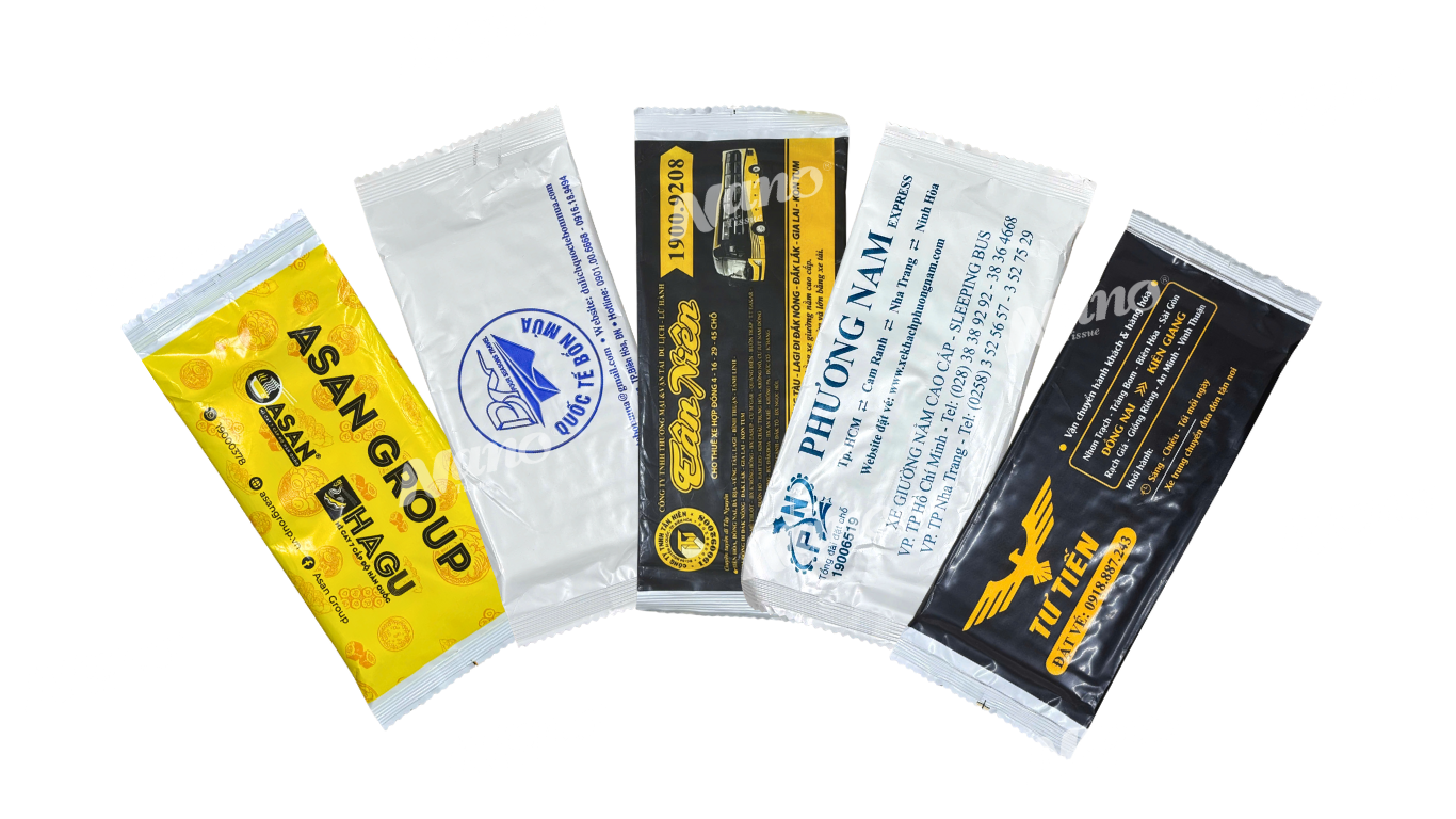 Khăn vỏ bao bì màng ghép (Vỏ nhựa bóng/Màng Ngọc Trai): Loại vỏ này thường dày và bóng hơn, cho cảm giác cầm nắm sang trọng. Đây là lựa chọn lý tưởng cho in khăn lạnh đẹp tại các nhà hàng, khách sạn hoặc tiệc cưới cao cấp, nơi mà bao bì cũng là một phần tạo nên giá trị thương hiệu.