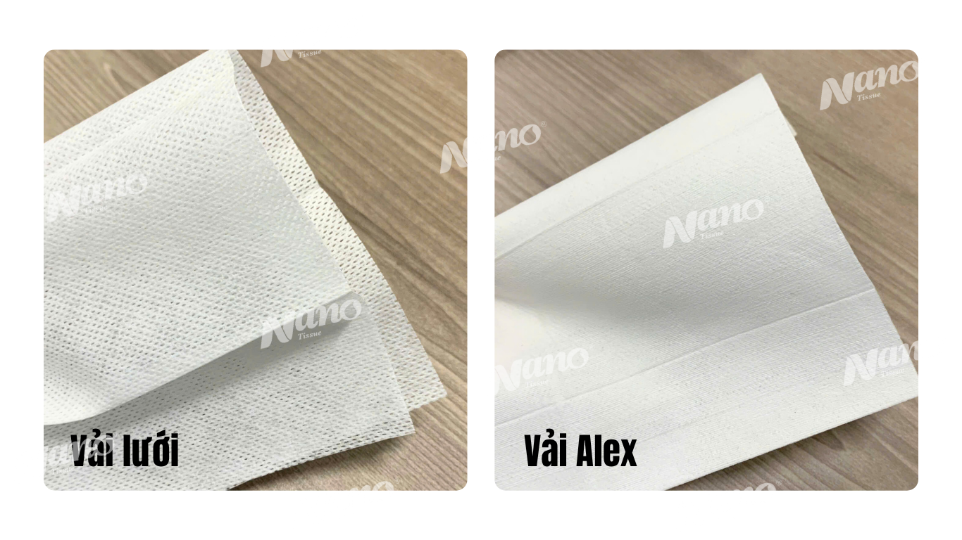 Vải Alex: Là loại vải cao cấp với bề mặt mịn, dày và mềm mượt. Vải Alex có độ dai tốt, giữ ẩm lâu, mang lại cảm giác mát lạnh và dễ chịu khi sử dụng. Thường được dùng trong nhà hàng sang trọng, spa hoặc resort cao cấp.